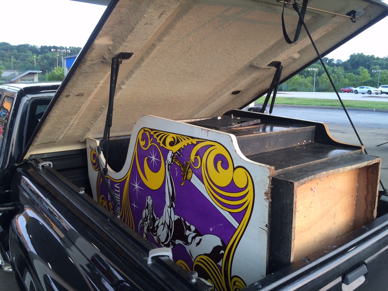 The seller lived about 20 minutes outside of the city, not a far drive, in a cute little neighborhood. Most of the homes were wood-siding, not quite like cabins but still funky and attractive. Seemed like a nice place to live. We pulled up and I saw the game for the first time! Needed some work, but a working Cosmic Guerilla wasn’t a game I was keen on passing up. I was very surprised at how short the cabinet is–shorter than a Nintendo cabinet. The seller generously helped me load the game into the back of the truck, and it fit under my raised topper without needing straps. The bed closed right up and we were on our way home! The way we figured it, we’d get home around 11:30pm our time, not counting a stop for dinner on the way.